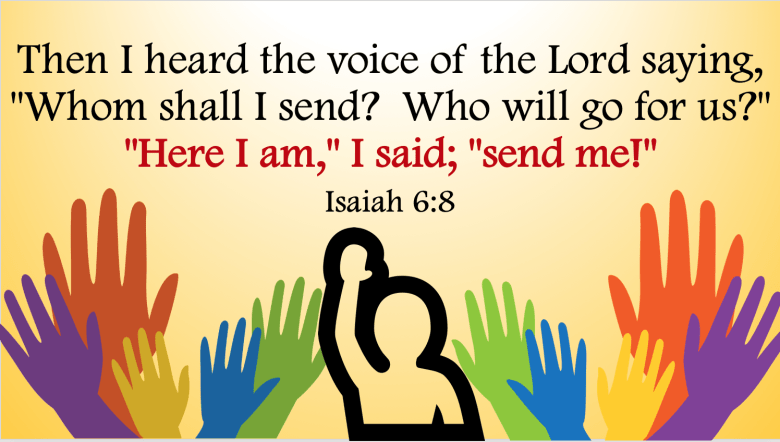 “Then I heard the Lord asking, “Whom should I send as a messenger to this people? Who will go for us?” I said, “Here I am. Send me.” (Isaiah 6:8)